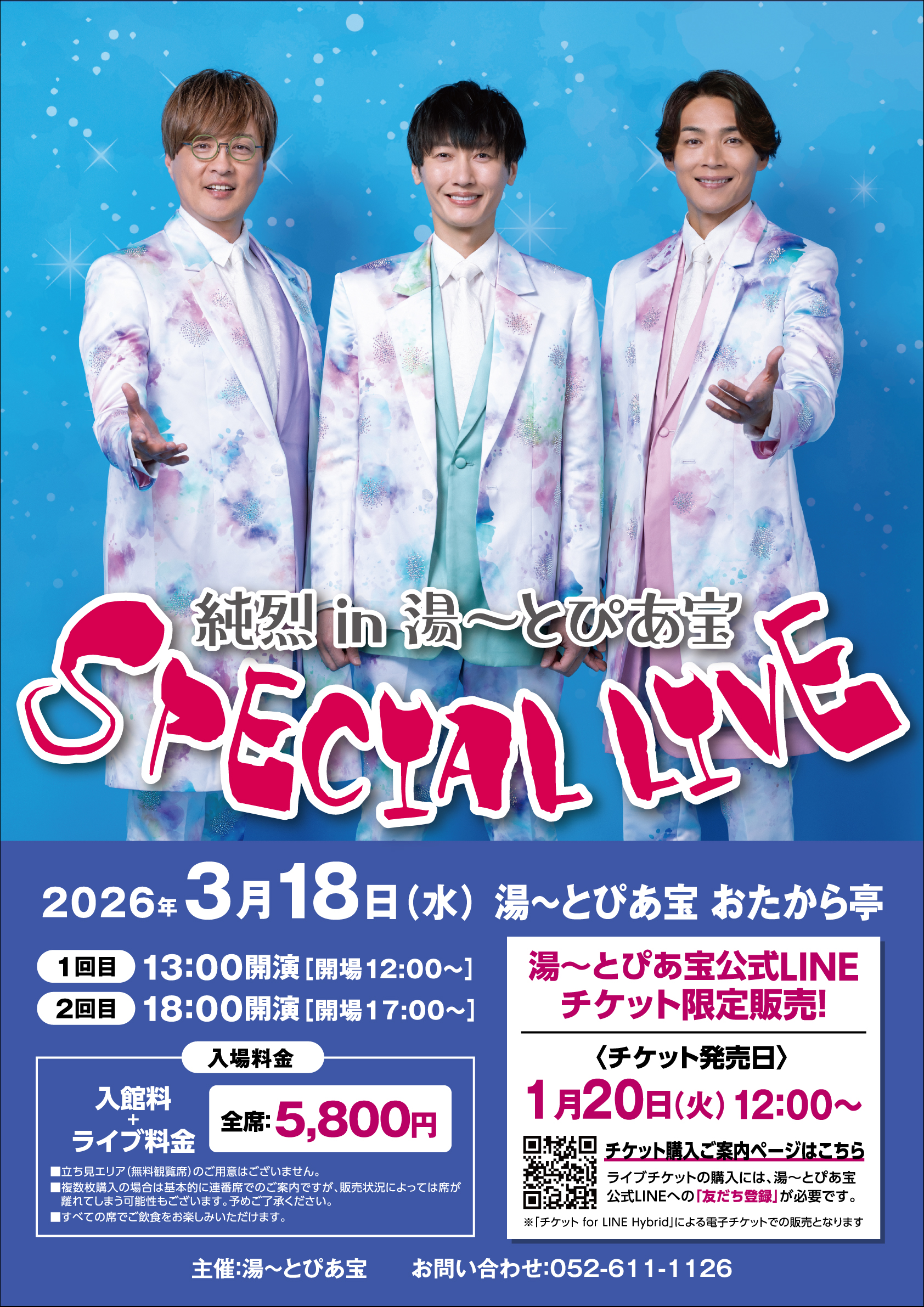2026年3月18日(水)『純烈 in 湯~とぴあ宝 SPECIAL LIVE』を開催いたします!