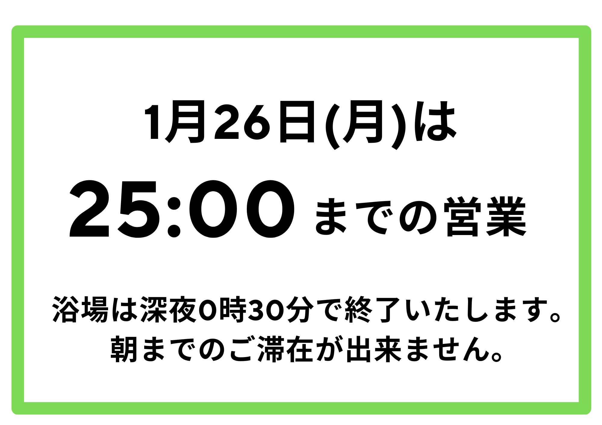 【お知らせ】1月26日(月)は25時で閉店いたします。
