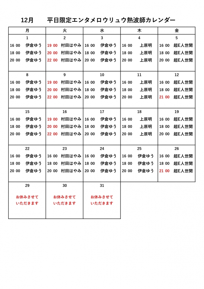 【 年末年始のご案内 】 12月27日(土)~1月4日(日)までエンタメロウリュウはお休みさせていただきます。