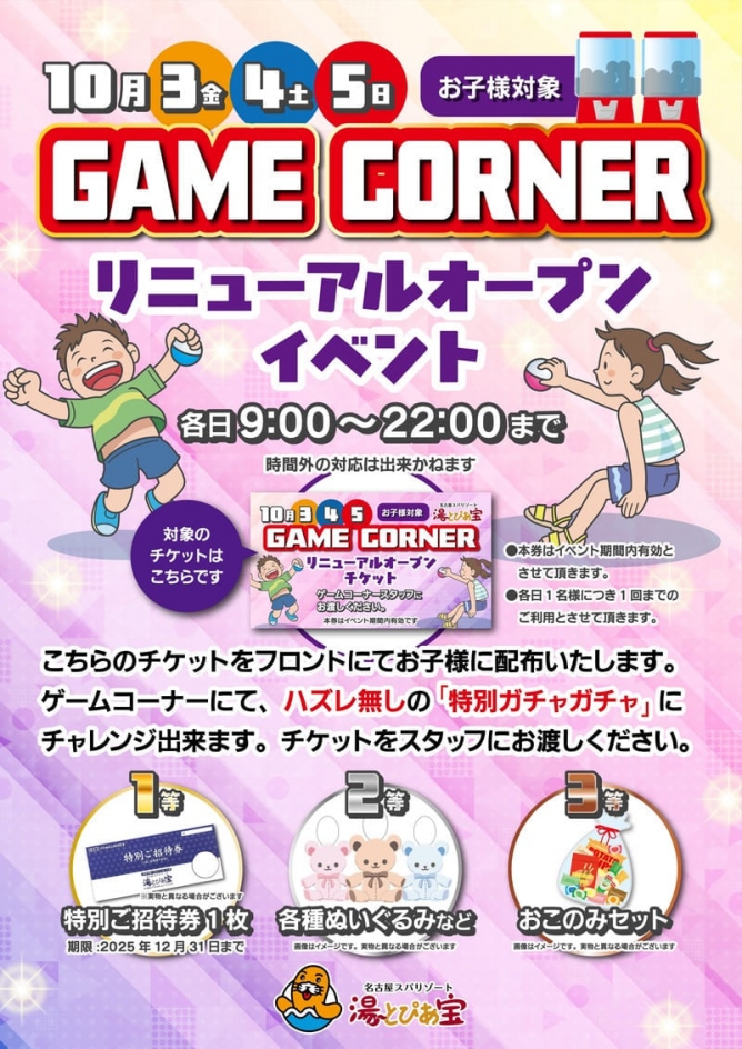 9月30日(火)15:00に湯~とぴあ宝1階ゲームコーナーが リニューアルオープンしました。 リニューアル記念イベントを10月3日(金)、4日(土)、5日(日)の3日間 開催いたします!