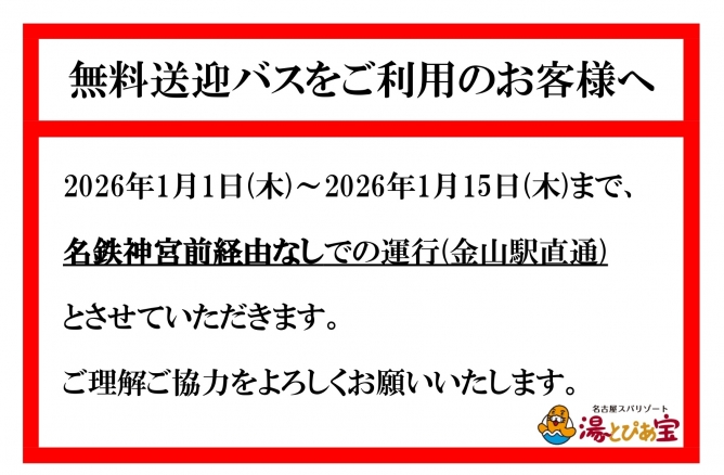2026年1月1日(木)~2026年1月15日(木)まで、熱田神宮周辺の交通規制のため、 名鉄神宮前駅経由無し(降車含)でのご案内とさせていただきます。 2026年1月16日(金)から通常運行致します。 ご理解ご協力をお願いいたします。