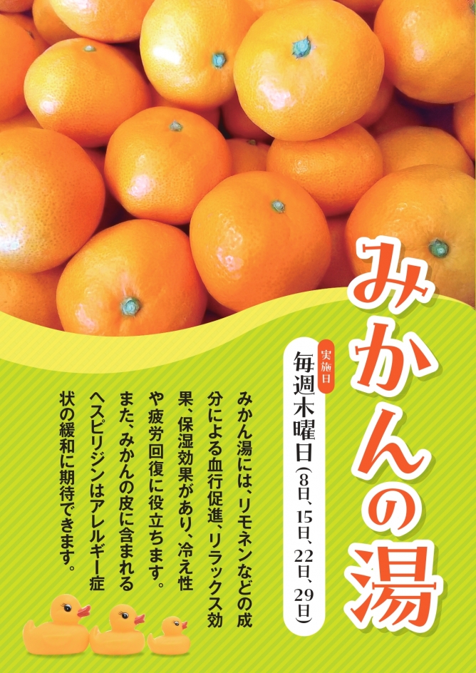 湯~とぴあ宝では1月8日(木)から毎週木曜日限定で『季節の湯』を開催いたします! 1月は『みかんの湯』を開催します。 桶に入れた本物の「みかん」を湯舟に浮かべます! 月替わりで毎週木曜日に「季節の湯」を開催して参りますのでお楽しみに!