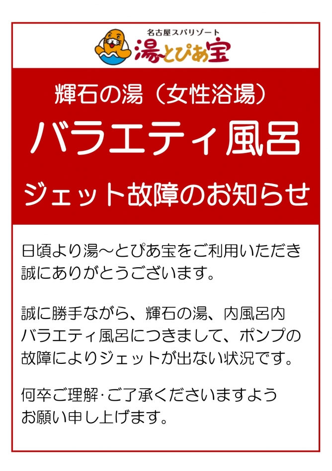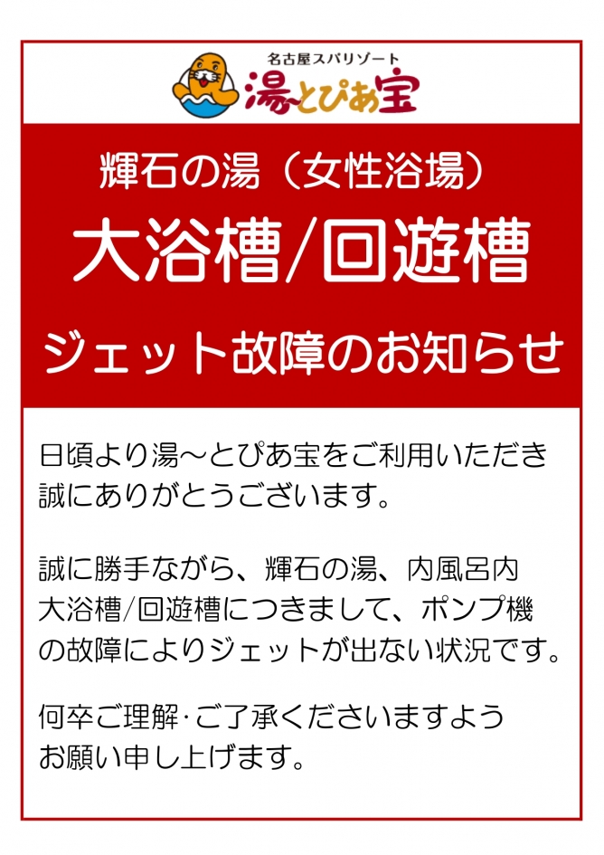 輝石の湯(女性風呂)大浴槽/歩行浴槽・バラエティ風呂 ジェット故障のお知らせ