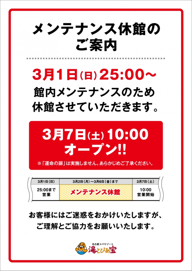 3/2(月)~3/6(金) メンテナンス休館のご案内 3/7(金)10時OPEN